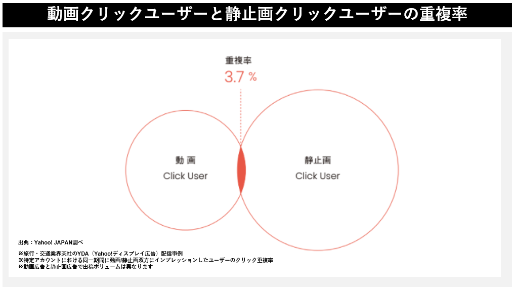 Yahoo! JAPANの調査によると、同条件で配信した動画クリックユーザーと静止画クリックユーザーのうち、重複しているユーザーは全体のわずか3.7%ほどという結果でした。