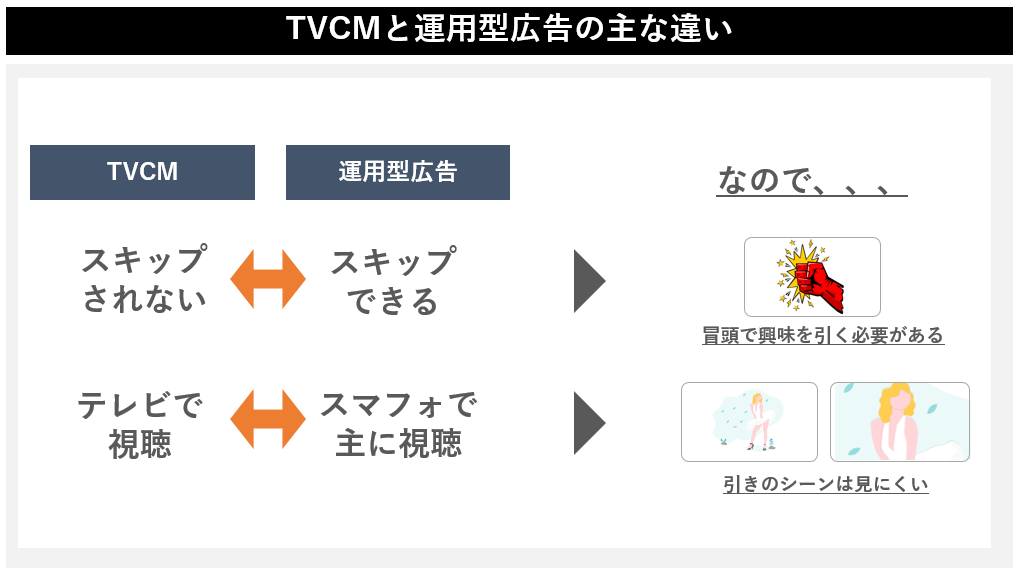 理由は簡単で、TVCMと運用型広告では視聴のされ方に大きな違いがあるためです。