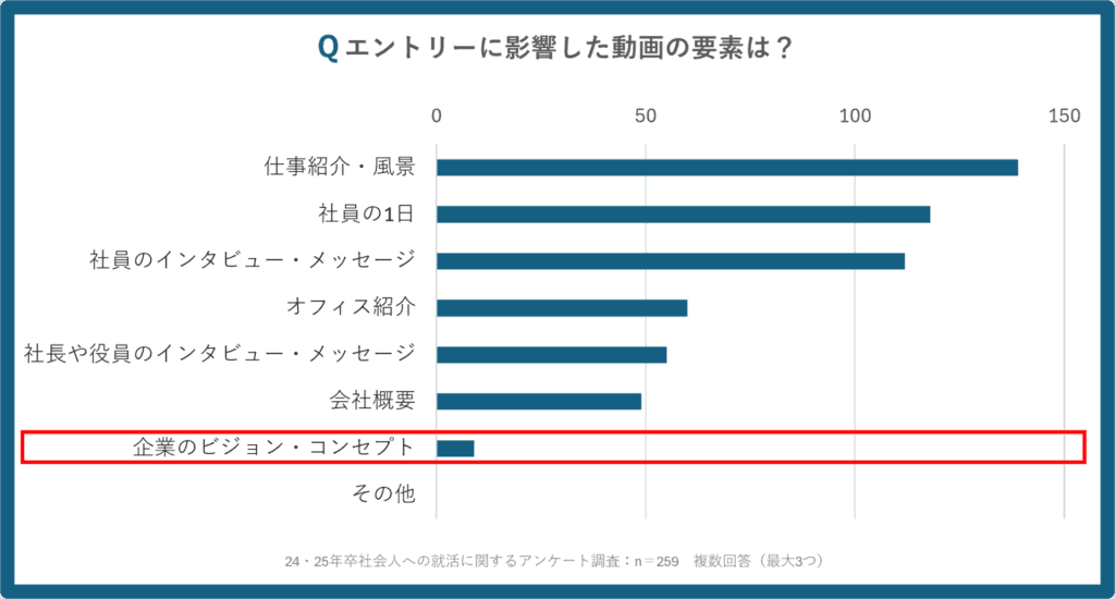 ここまでの調査結果より採用エントリーの母集団形成に効果的な採用動画は、仕事紹介や社員インタビューを通して会社の雰囲気などが伝えられる動画と考えられます。