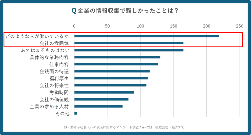 反面、会社の雰囲気などは就活生が情報取集で苦労していることがわかりました。